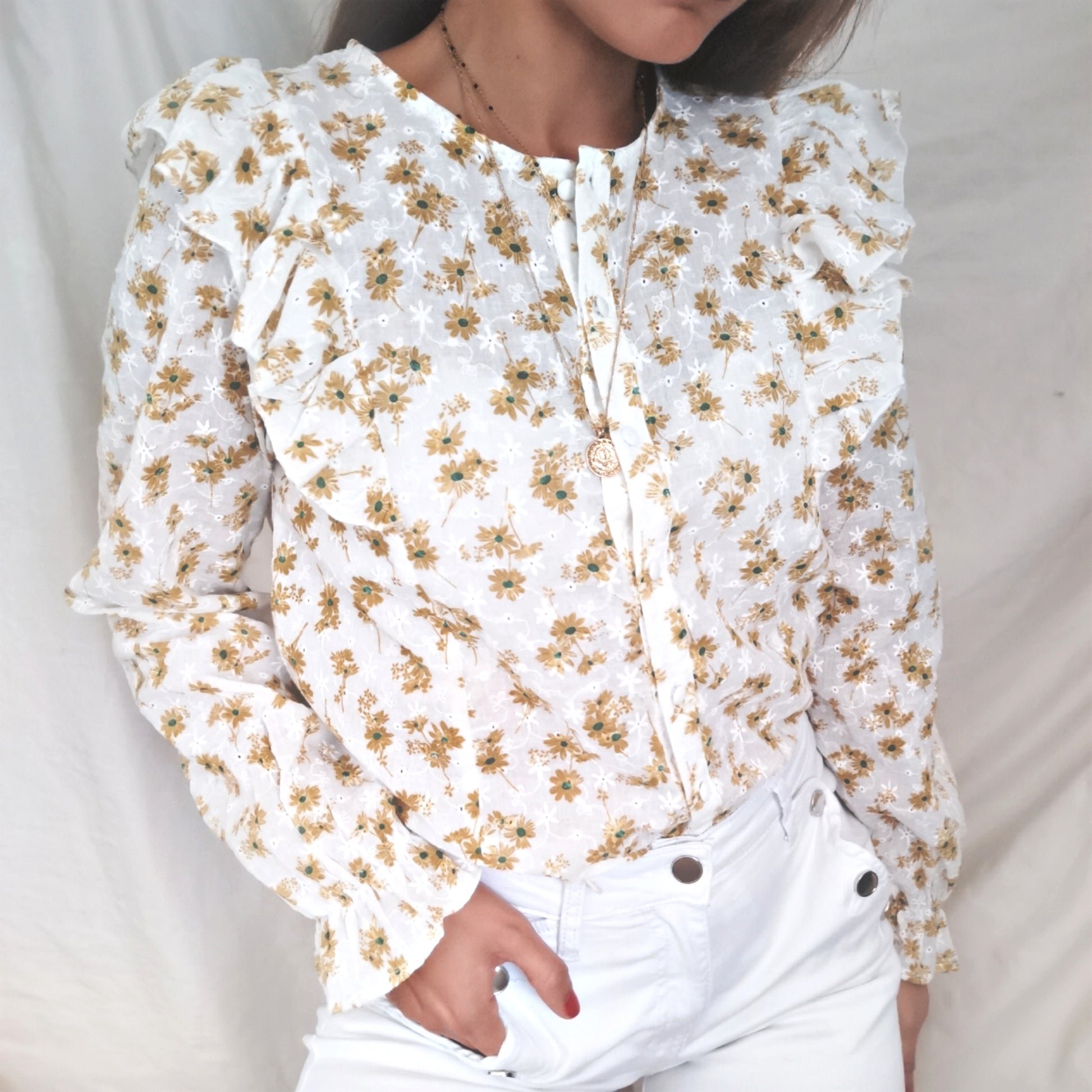 Chemise fleurie en broderie anglaise à manches longues resserrées par un élastique